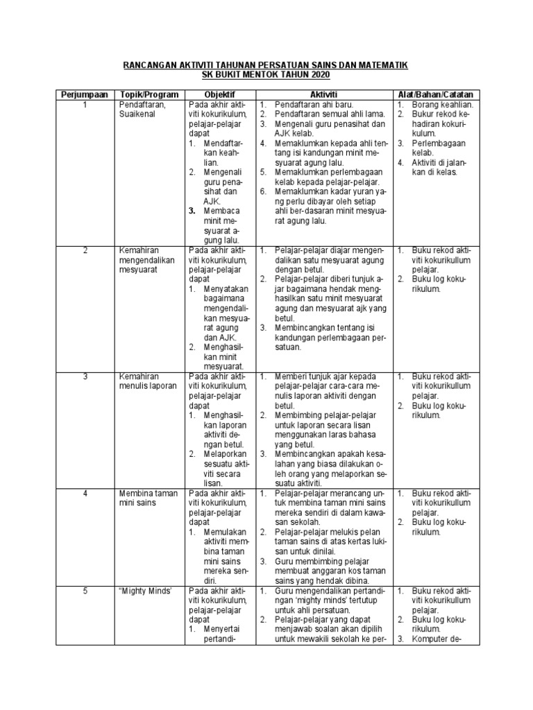Rancangan Aktiviti Tahunan Persatuan Sains Matematik Tahun 2020