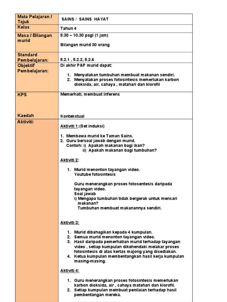 Contoh Rph Sains Tahun 4